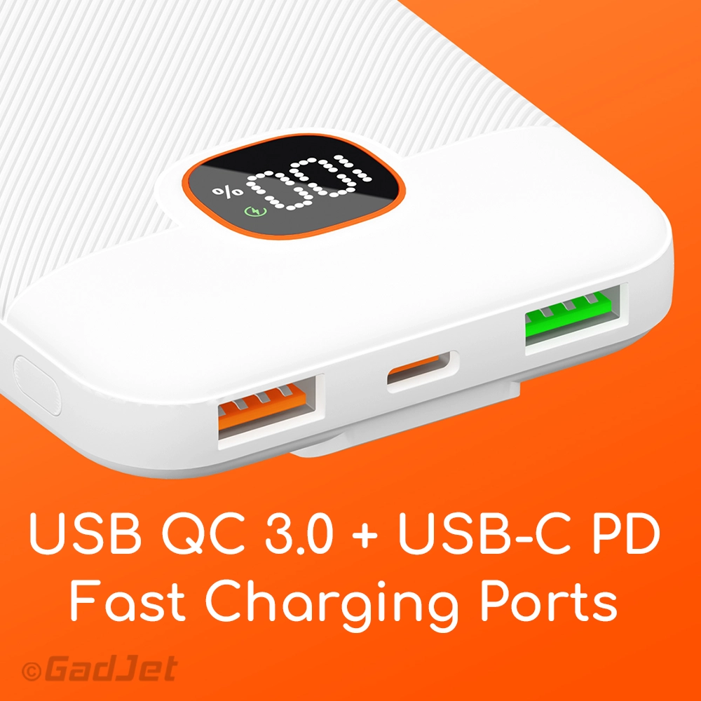 GadJet Rapid 10,000mAh 4-in-1 Power Bank includes USB-C PD and USB-A QC 3.0 ports for fast, efficient charging of multiple devices at once.