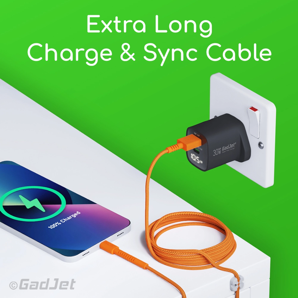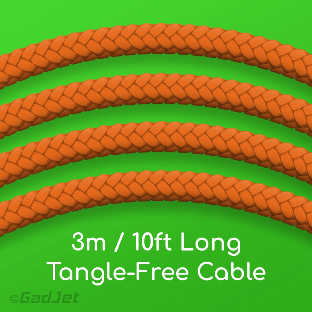 The GadJet Extra Long 3m USB-A to Lightning Cable delivers reliable 2.1A charging and fast data sync, featuring a durable braided design, reinforced connectors, and a convenient cable tie for easy storage.
