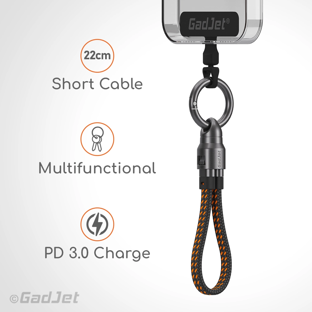 Experience fast, reliable charging with the GadJet Mini Keyring Charge & Sync Cable, delivering 60W PD power in a compact, portable design with a durable braided finish.